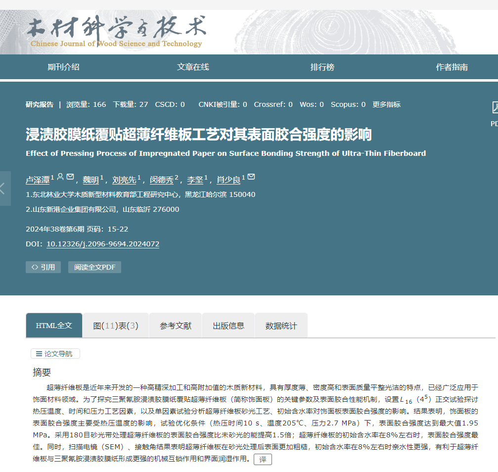 該研究以“浸漬膠膜紙覆貼超薄纖維板工藝對(duì)其表面膠合強(qiáng)度的影響”為題發(fā)表在《木材科學(xué)與技術(shù)》2024年38卷第6期上,得到了2023年山東省重大創(chuàng)新工程項(xiàng)目“特種木質(zhì)新材料制造關(guān)鍵技術(shù)”(ZQTYB240700001)等項(xiàng)目支持。東北林業(yè)大學(xué)碩士研究生盧澤潭為第一作者,肖少良教授為通訊作者。