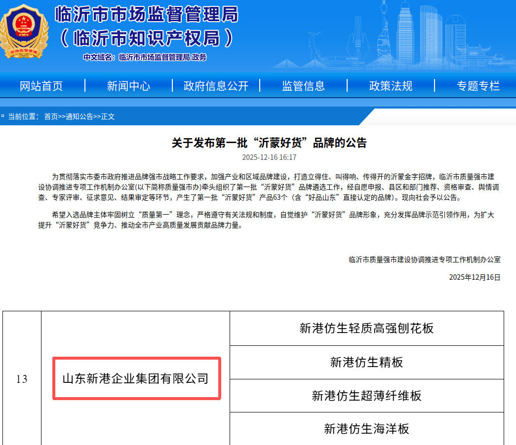 近日,臨沂市質(zhì)量強市建設(shè)協(xié)調(diào)推進專項工作機制辦公室發(fā)布公告,公布第一批“沂蒙好貨”品牌名單。經(jīng)過縣區(qū)和部門推薦、資格審查、輿情調(diào)查、專家評審、征求意見、結(jié)果審定等環(huán)節(jié)的嚴格篩選,最終僅有63個優(yōu)質(zhì)品牌脫穎而出。其中包括山東臨工、魯南制藥、史丹利這些知名企業(yè)。而在上萬家板材企業(yè)中,新港集團成為唯一上榜的板材企業(yè)。
