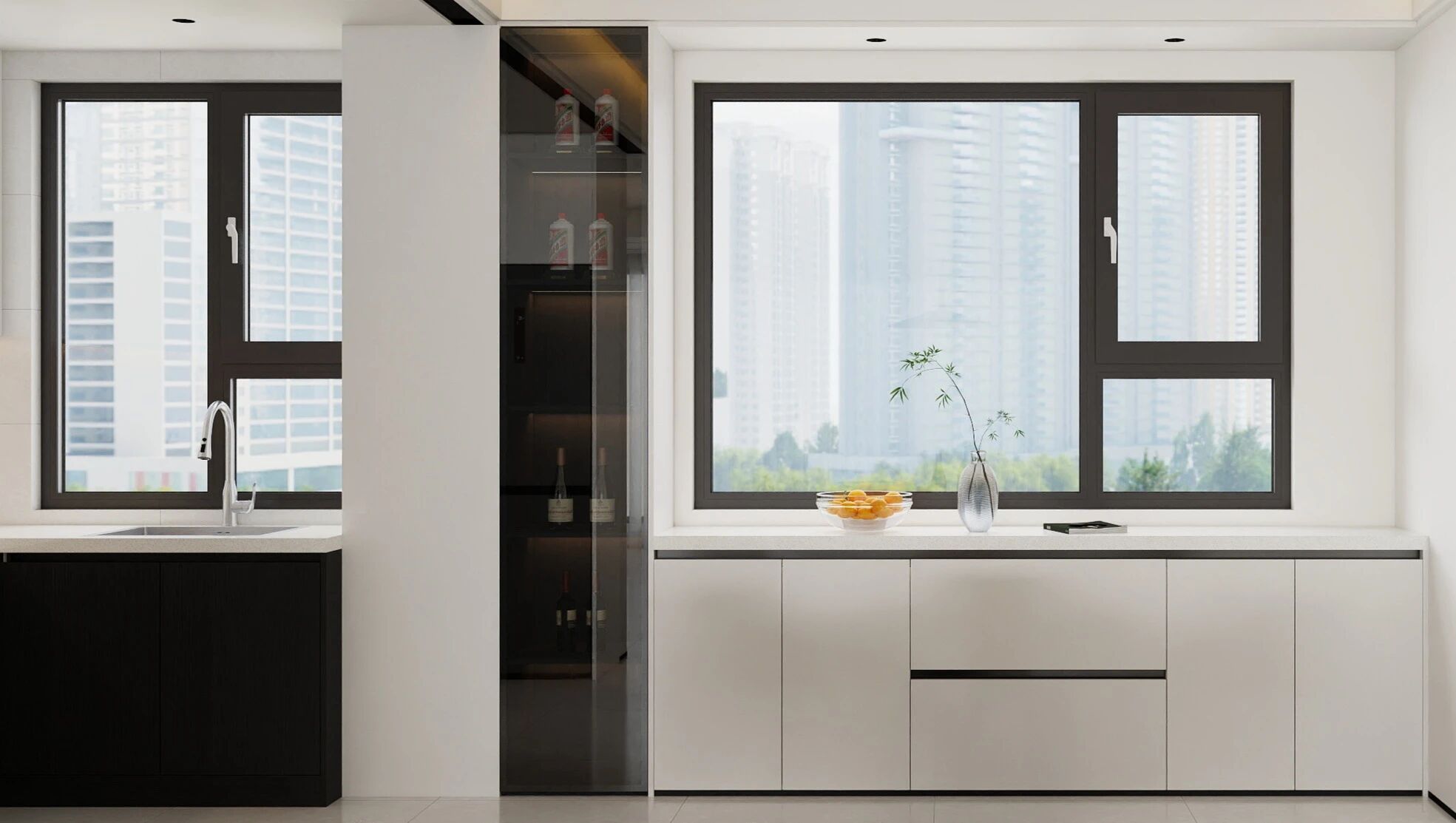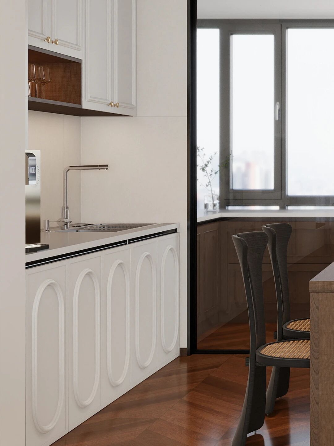 不加繁飾,靠一盞窗引入天光,雅白作為櫥柜主色,與乳白大理石面板、墻面融為一體,營造出靜謐、通透、溫潤的視覺層次。