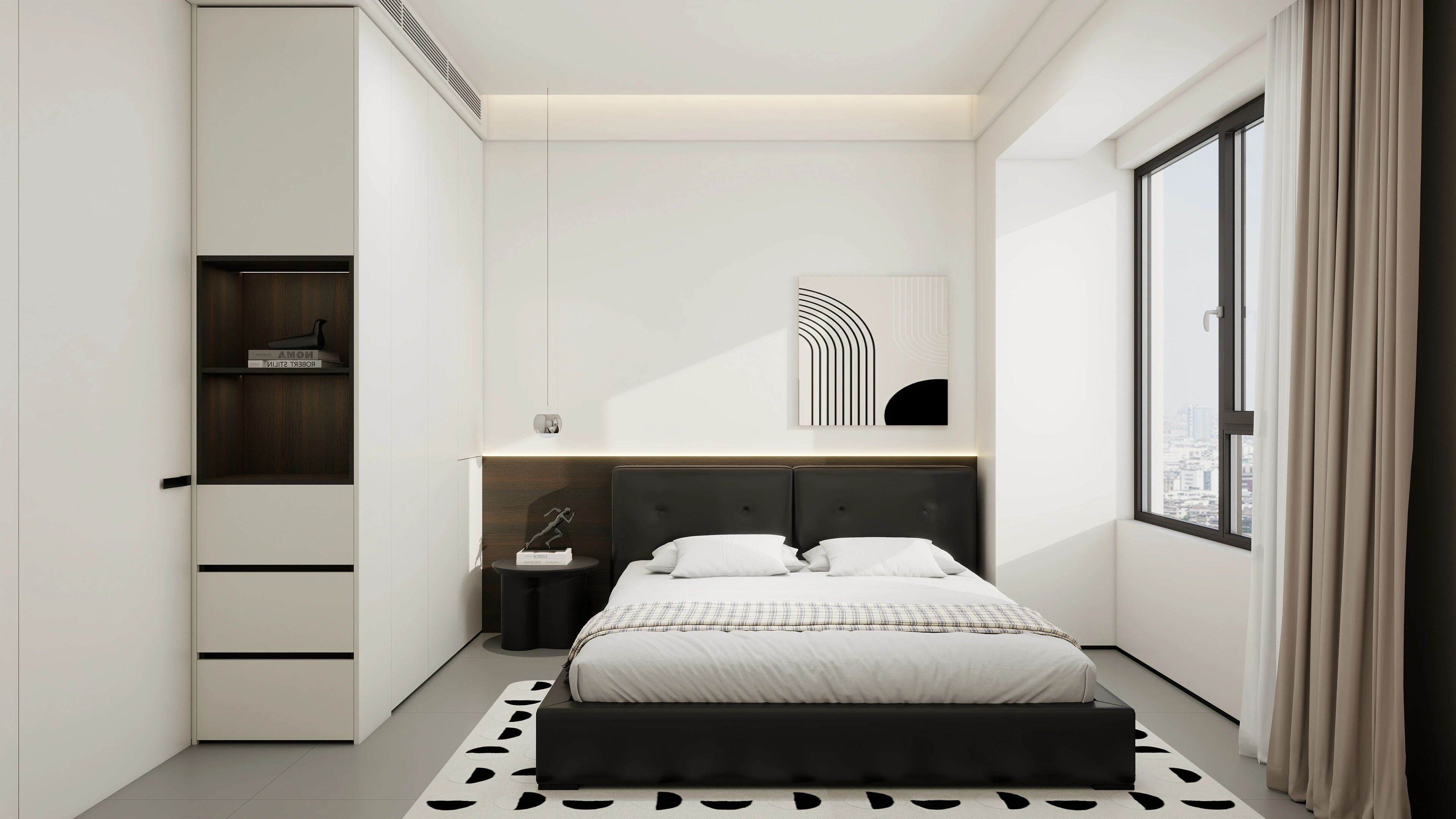 當空間歸于極簡時,更能展現出雅白的魅力。這間臥室,只采用黑、白、卡其三種常見卻自帶高級感的色彩。雅白衣柜正面窗戶,隨著一天中陽光照射的強度與角度的變化,柜體自然呈現出漸變的色彩。晨曦的溫潤、日光的溫暖、夕陽的燦爛,都在這小小的衣柜里收納。