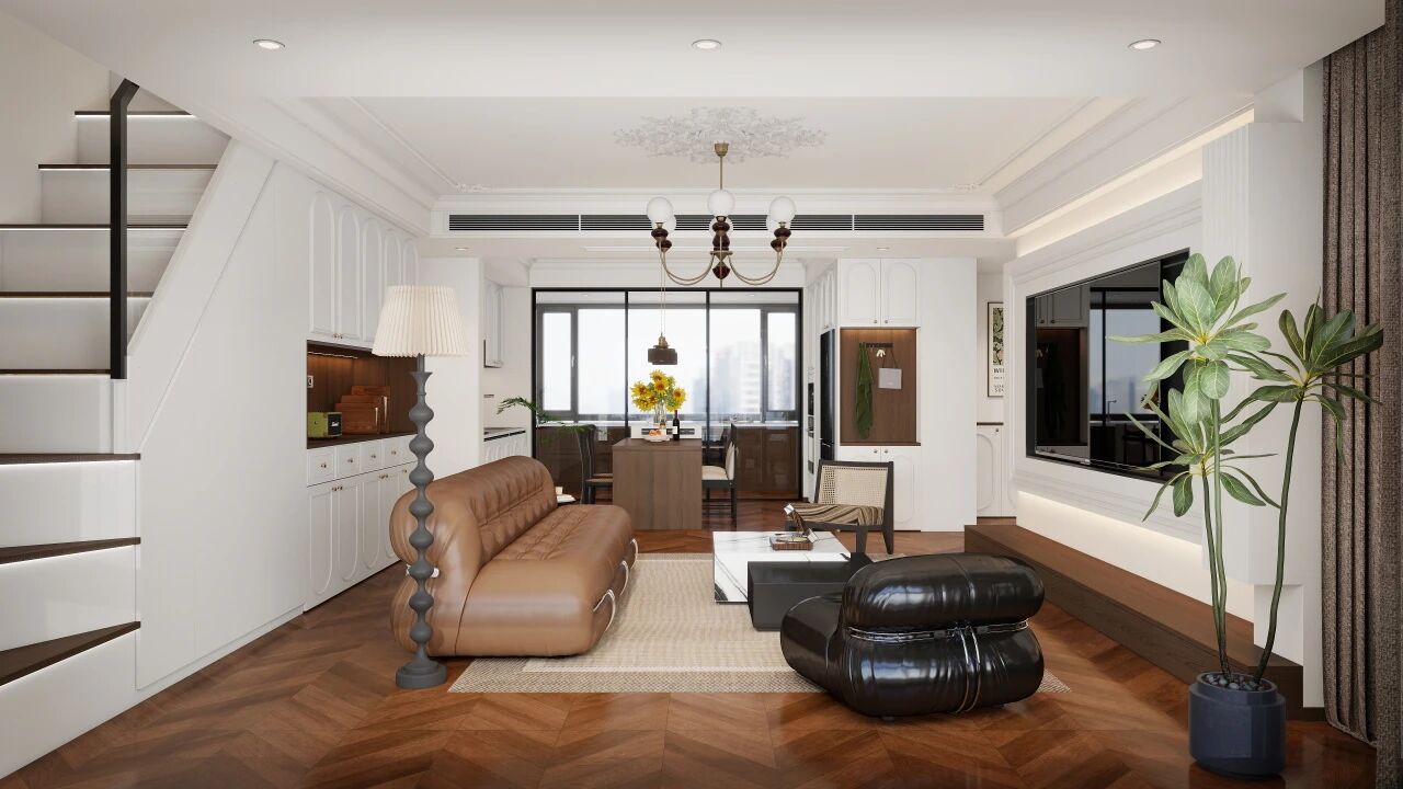 開放式的設計打破傳統客廳、餐廳的界限。視覺上,天花板、餐邊柜、電視背景墻、室內臺階均為白色系,營造出漂浮靈動的感受。地板、沙發、落地燈柱、餐桌均為棕咖、黑色系,中和了白的飄渺,對色彩的極致應用,構建出空間的韻律與美感。